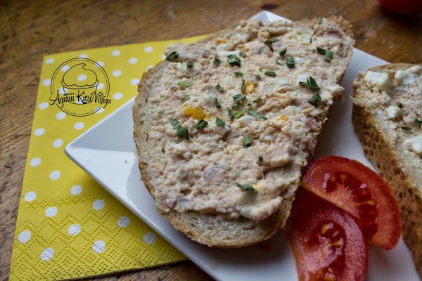 Szóval mehet be a turmixba a sonka és a mascarpone. Érdemes a sonkát kicsi darabokra vágni, hogy a gép könnyebben össze tudja darálni. Ha túl sűrűnek találjátok a masszát, akkor nyugodtan tegyetek bele egy evőkanál kefírt vagy tejfölt, hogy egy kicsit lazuljon. Ahogy ez meg van, hozzáadjuk az apróra vágott tojást és a hagymát, jól összekeverjük kanállal. Szerintem nem is kell sózni a krémet, mert a sonka miatt elég sós, de ha nektek sótlan, nyugodtan sózzátok, borsozzátok meg.