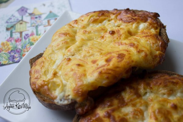 A kenyerek alját bevajazzuk, a vajas felükkel lefelé beletesszük a tepsibe és a tetejére rákenjük a masszát.
